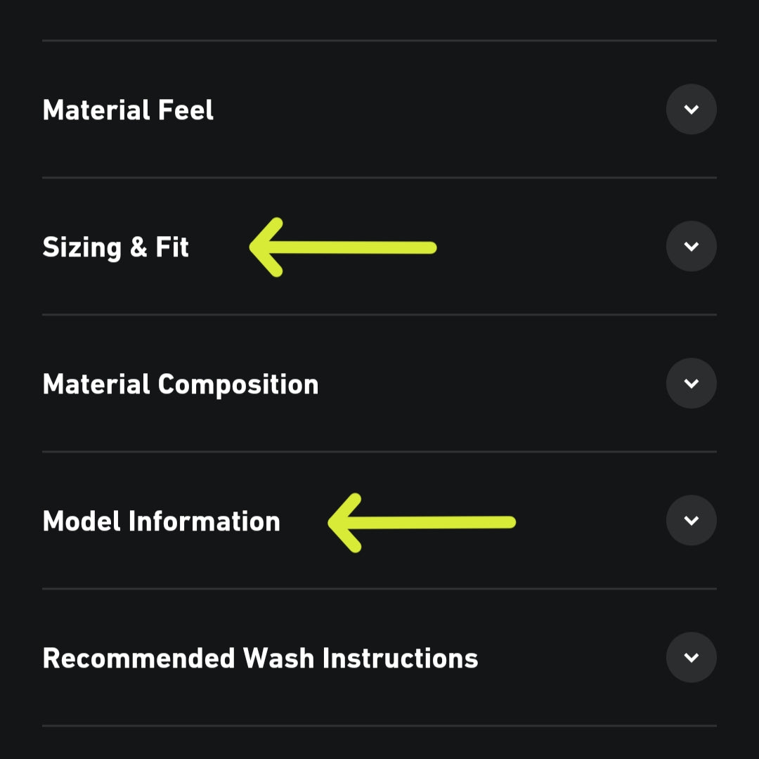 The most relevant sections tend to be labeled with "Sizing," "Fit" & "Model Information."